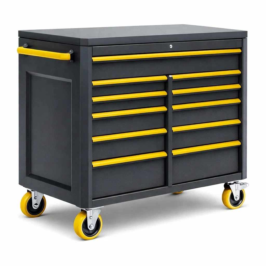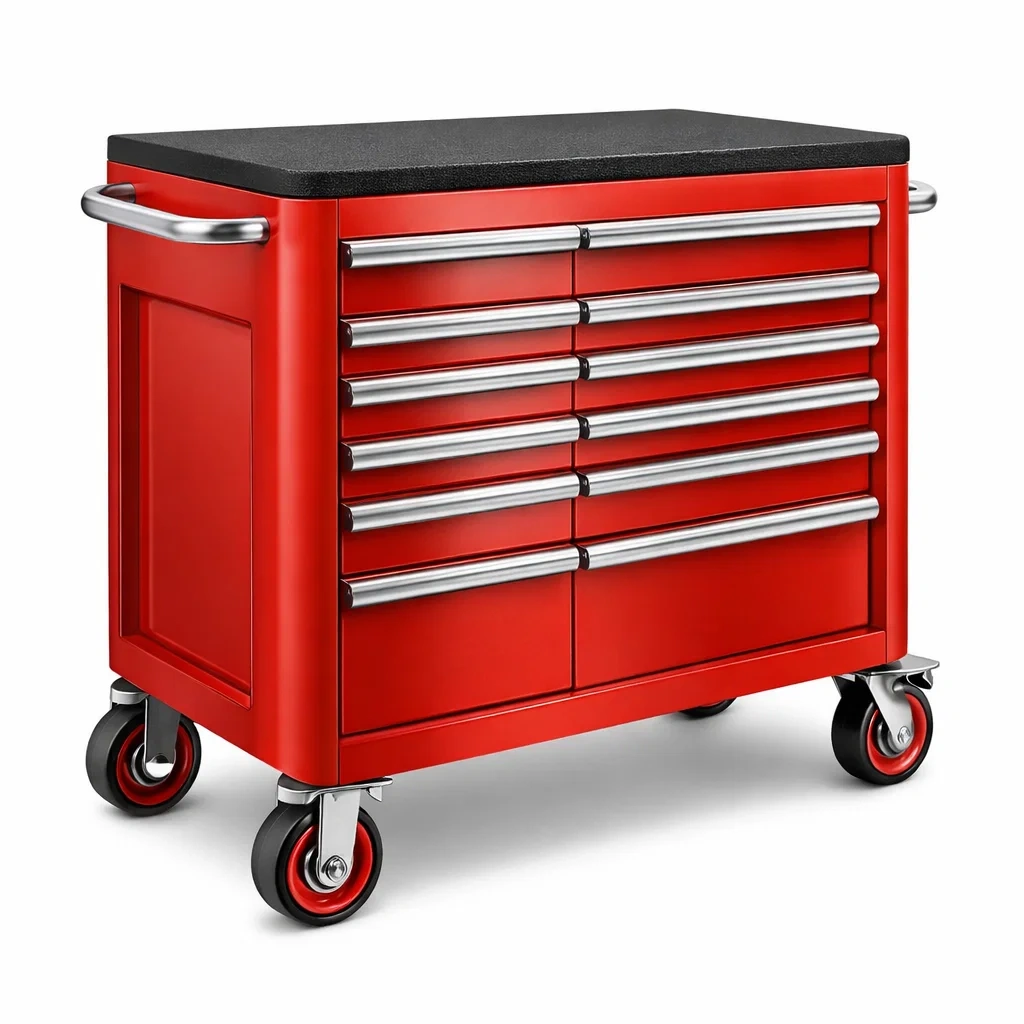 Chariot à outils en métal rouge avec roulettes et 12 tiroirs