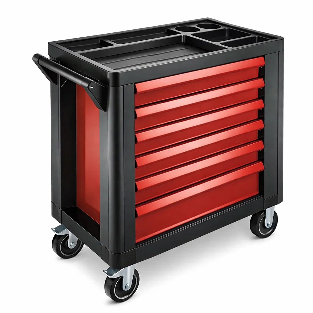 Ce chariot à outils est conçu en métal robuste, offrant une longue durée de vie. Il comporte 6 tiroirs spacieux, chacun pouvant supporter une charge maximale de 50 kg. Les roulettes pivotantes avec frein facilitent le déplacement et garantissent la stabilité.