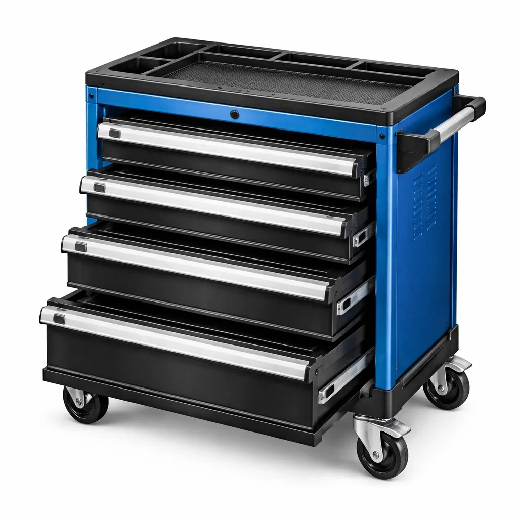 Comprend 4 tiroirs et un plateau supérieur avec compartiments. Équipé de roulettes pour facilité de déplacement. Mécanisme de verrouillage inclus.
