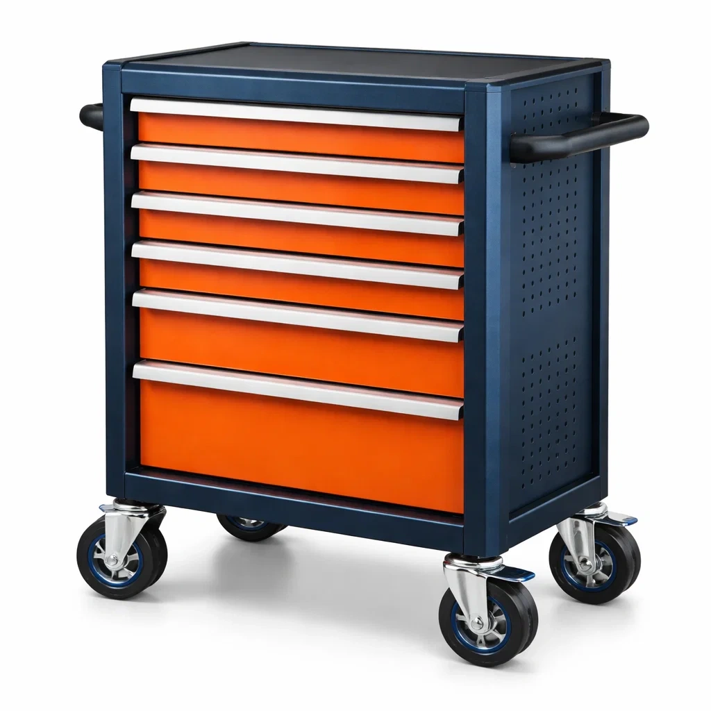 Le chariot comporte six tiroirs pour un rangement organisé des outils. Les tiroirs sont équipés de rails pour un coulissement facile. Poignée latérale pour une manipulation aisée.