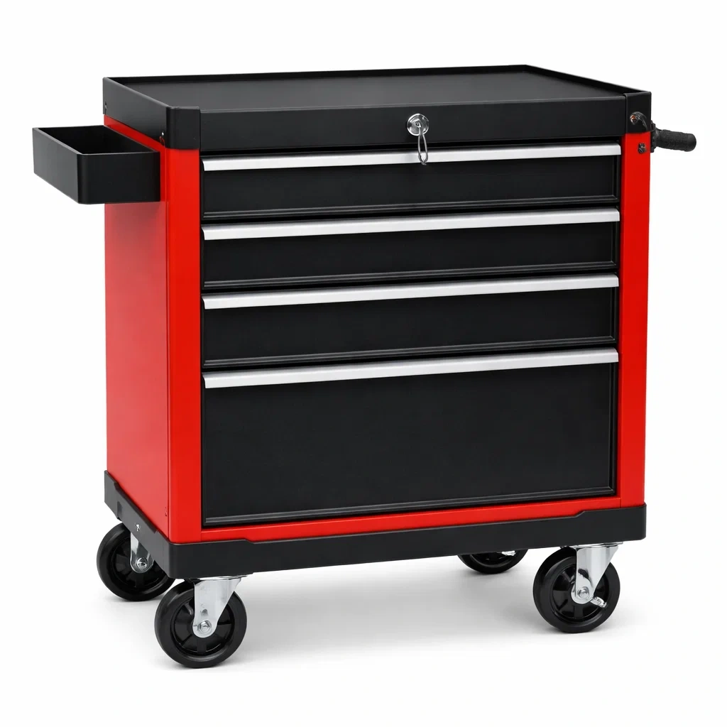 Ce chariot d'atelier est fabriqué en acier avec des roulettes en caoutchouc solide, permettant une mobilité facile. Il comprend plusieurs tiroirs verrouillables pour le rangement sécurisé des outils.