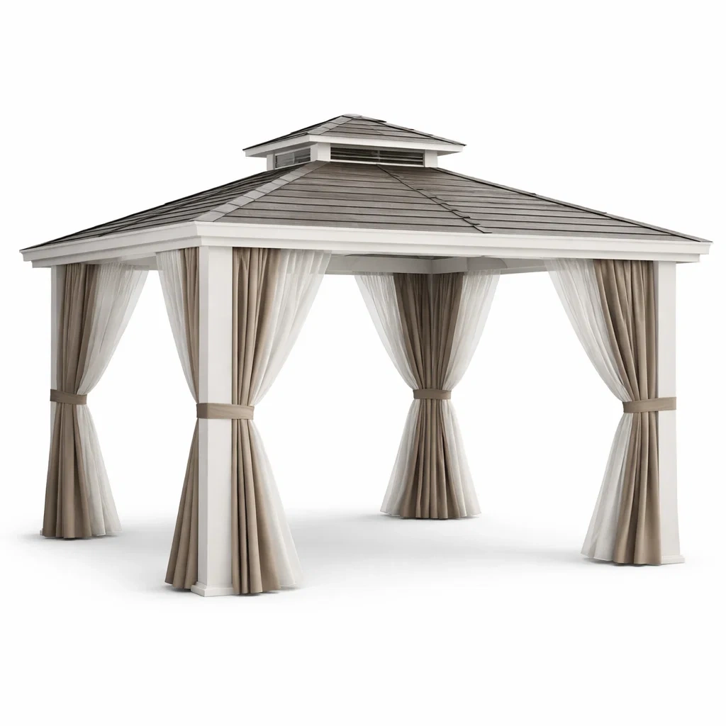 Ce pavillon est équipé d'un toit en acier galvanisé de 0.5 mm d'épaisseur et de rideaux en polyester. La structure est faite d'acier avec une finition résistante. Les rideaux en polyester sont amovibles pour une utilisation flexible.