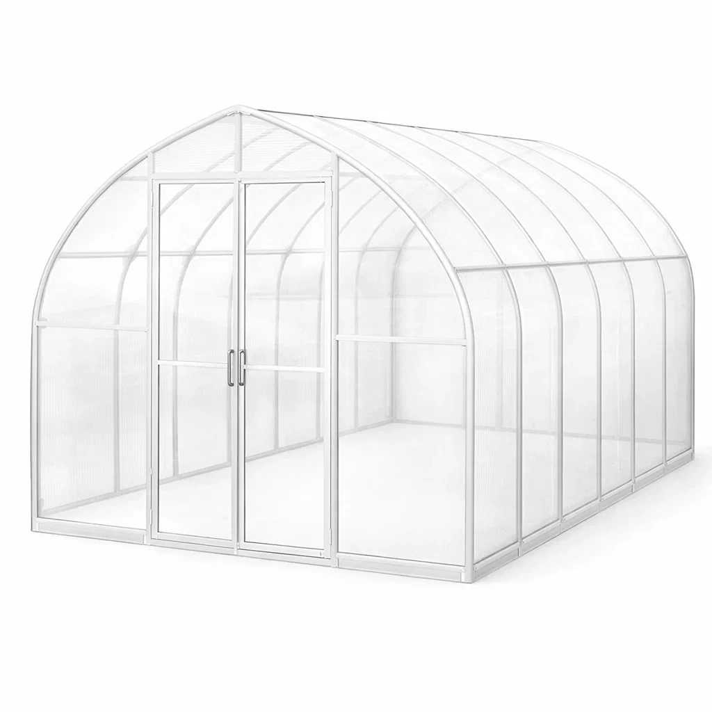 Cette serre est fabriquée avec un cadre en aluminium et un revêtement en polycarbonate. Les dimensions sont de 500 cm de longueur, 300 cm de largeur et 250 cm de hauteur.
